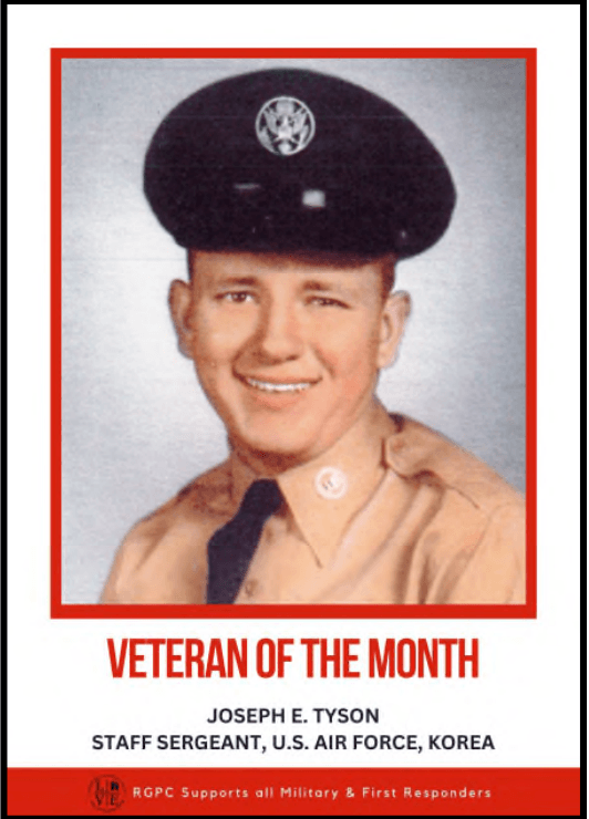 We are recognizing Joseph E. Tyson Staff Sergeant, U.S. Air Force, Korea Joe graduated from Roosevelt High School in Wyandotte, Michigan in June, 1950. He joined the Air Force in early 1951 and attended basic training at Lackland AFB in San Antonio, Texas. After basic training, Joe was sent to a Special USAF Program at USC College of Aeronautics, graduating with a 3.9 GPA. He also attended the USAF Business Management School and earned a degree from Central Michigan University.